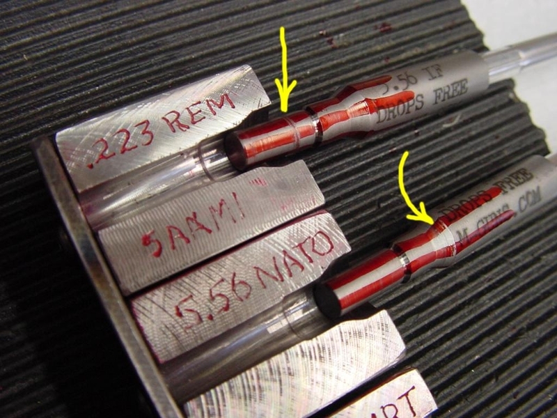 This gage tells you if you have a chamber that is 5.56 NATO (or larger), or something shorter/smaller. The gage looks a lot like a headspace gage but it does not gage headspace. It comes with its own rod which you thread into the tapped hole in the back of the gage. Unload and open your rifle, pull the bolt group, make sure the chamber is clean so there is no false reading, and drop the gage in. If the gage's shoulder "clinks" off on the shoulder of the chamber and the gage drops or pulls free without sticking or resistance, you have a chamber that is 5.56 NATO or larger. If the gage goes in and wants to stick, as in, you let it in and it pulls with a little resistance, or you try and turn it but it does not turn freely, you are short of 5.56 NATO and probably have a .223 chamber. You can color it up with a Sharpie, put it in and spin it (clockwise) to observe where it's contacting the chamber first. Note that the gage will also stick in a .223 Wylde chamber since the Wylde's freebore is smaller in diameter than the 5.56 NATO's. It's my opinion that the Wylde chamber ought to be OK with 5.56 NATO ammo, but I have not delved into this scientifically. I don't own anything with the Wylde chamber, so I have no first-hand experience with it. The smaller freebore, I suppose, would make it more crud-sensitive. The newly designed (3/15) handle acts as a case for the gage, preventing loss and damage. Probing either a .223 SAAMI or .223 Wylde chamber with this gage will not harm the chamber unless you decide to really try by hammering it in. Don't do that. Price is $85, add $10 for Priority Mail, or $5 for first class.