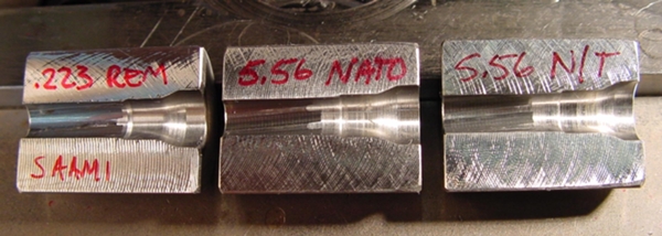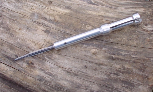 Now also available in 6.8 SPC with long freebore and throat! Add $20 for 6.8 SPC. A common problem when firing 5.56 mil-spec ammo in an AR15 with a SAAMI-spec .223 chamber, is that once in a while a spent primer will fall out of a case as it is extracted. Sometimes the primers fall clear and there's no problem, other times they will go under the trigger and get wedged, rendereing the rifle inoperable. I've seen some extreme cases of this where the hammer and trigger were actually hard to get out. I've seen them get wedged between the charging handle and the inside of the receiver, with the bolt out of battery, so that the gun had to have the stock removed so the bolt could be removed to clear the primer. It is not unknown for the primer anvil get stuck on the tubular portion of the carrier key! Popped primers are due in part to the tighter, shorter freebore and shorter, more abrupt throat of the .223 chamber, causing a pressure spike with the hotter, mil- spec ammo. This reamer will address these areas as well as making sure the neck diameter is not too tight or short, without changing headspace. It does not cut the shoulder or anything behind it; it stops off on the shoulder. Of course, whatever rifle you're shooting, you could just look at what's stamped on the barrel-- it might say .223, or it might say 5.56, or it might say nothing. You could call the manufacturer and ask them what chamber you have, but even if you get to talk to somebody who understands the question, they likely don't really know. They may tell you what you want to hear, but truth is, not many AR15 manufacturers make their own barrels. They buy them from someone else, so they don't really, truly know what chamber you have. Some of them will flat decline to discuss it with you. This reamer is designed as an easy, quick and sure way to know. You just open the upper receiver, remove the bolt group, drop in the reamer with some oil, and slowly turn it in (clockwise only, never reversing it), using a lot of turns and very little pressure. The handle centers itself in the upper receiver. When ithe reamer bottoms out on the chamber's shoulder it will spin freely-- it has stopped cutting and you are done. When you have done this, you know for sure you have a chamber with proper 5.56-plus dimensions in the critical freebore and throat area. Primer popping due to pressure spikes in a short leade will cease, but be advised there can be other factors in popped primers such as hot ammo, hot chambers, and improperly loaded ammo. The new version ($250, shown above) has a redesigned handle that is custom machined from aluminum barstock, so it is quite a bit lighter (handle and reamer weigh less than the original handle alone). It is also shorter to take up less room in your toolbox, and, most importantly, it functions as a storage case for your reamer. When you are finished reaming, simply remove the reamer, reverse it, and insert it into the handle-- your expensive tool is now very well protected and not taking up extra room in your toolbox. There is also a slot in the handle to accept the Allen wrench you need to turn the set screw that retains the reamer. The Allen wrench is retained in the handle so everything you need is right there. What about chromed-lined chambers? The good news is that in my experience, Colt AR15 chromed barrels have a proper 5.56 chamber. I would consider most others to be suspect. The reamer has been subjected to a secondary heat-treating process, titanium carbo-nitride, which makes it capable of correcting under-spec chromed chambers. Obviously it will do fewer of them, but I have yet to hear of one of my reamers geting dull-- and my personal one has done at least a few dozen chromed chambers. Will removing the chrome be a problem? No. Plenty of AR's don't have chromed bores and chamber and they work fine. I've sectioned some chromed barrels and the chrome doesn't last that long in the throat area anyway. Removing chrome in the chamber won't cause the area to peel like bumper chrome. Reamer with new lightweight/compact handle that doubles as reamer storage: $295, add $10 for shipping. I always ship Priority Mail which usually gets it there in three days or less.
